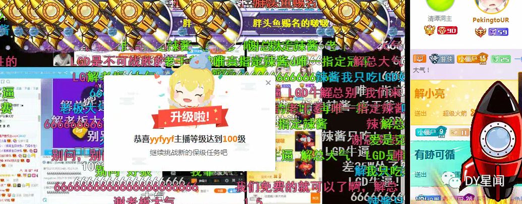 之后,伴随着一曲改编版《浮夸》,解总在直播间送出10发超级火箭,与此同时,yyf成功渡劫100级。