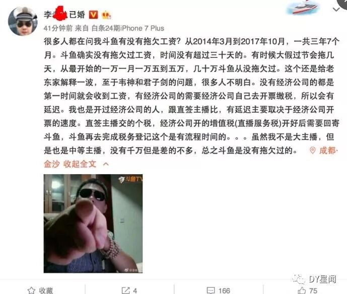 在本次的蛇哥欠薪事件中,身为旁观者的他,依旧将“斗鱼忠猪”这个核心价值观坚持到底,对其第一喜欢的斗鱼不离不弃并于27号这天怒发319字微博(标点符号在内)力挺斗鱼表示:
