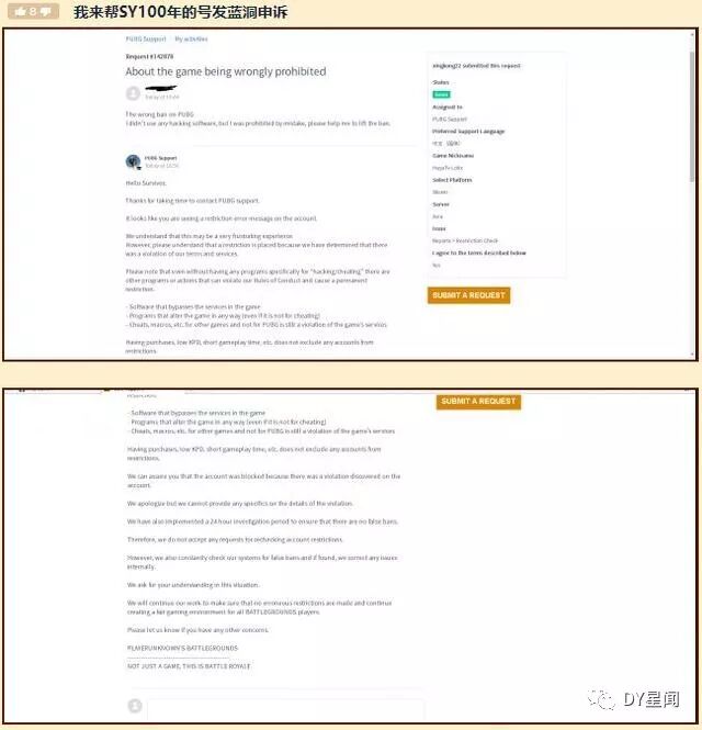 对此有网友表示作为官方鉴挂组成员的SY估计应该是一种误封,很快就能解封了,并帮其向蓝洞官方申诉了,但是结果却被蓝洞官方给驳回了。