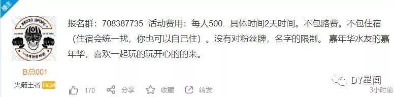 斗鱼嘉年华将至,B总也在鱼吧上组织了一场99233水友的嘉年华聚会。但开出的条件是需要交500元的活动费用,为期两天,并且路费和住宿自理。