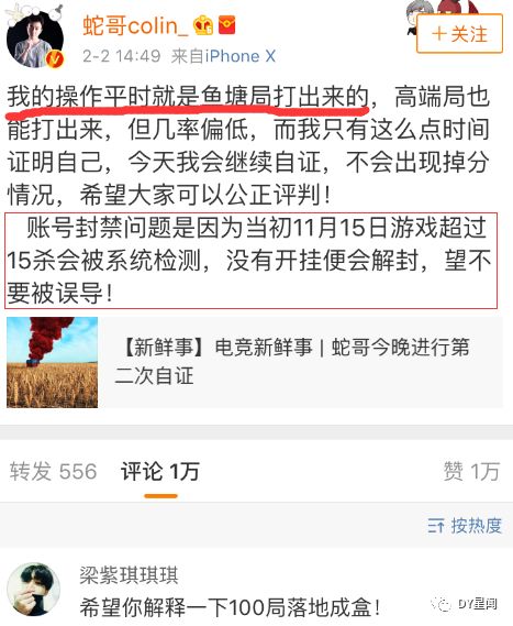 2月2日下午,蛇哥在微博中回应了第一天自证中网友对他的两点质疑:600分鱼苗局虐菜(蛇哥:平时直播打的就是鱼塘局)