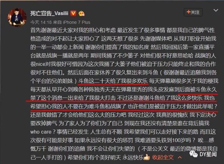 对于自己自己做的错事让粉丝们担心表示道歉;感谢多年来一直支持自己的媒体;同时也呼吁粉丝不要怪罪于斗鱼永封自己:“他们是迫于压力才做出此举”;
