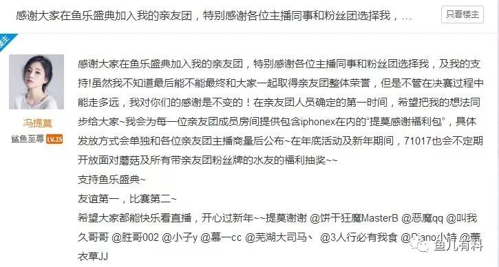 冯提莫还会为每一位亲友团成员房间提供包含iphonex在内的“提莫感谢福利包”!而自己也会不定期开放面对蘑菇及所有带亲友团粉丝牌的水友的福利抽奖!(文章来源微信公众号:鱼儿有料)