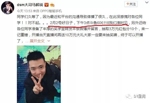 在1月31号这天终于尘埃落定,大司马于微博宣布,时间定在2月2日,将在斗鱼平台复播。