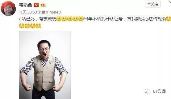 在2月3号凌晨,黄旭东于微博上发文:A站当年不给开认证号,导致都没办法传视频,并吐槽a站已死,有事烧纸。(文章来源微信公众号:DY星闻)