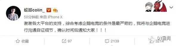 那位之前和蛇哥对接的超管在微博上透露蛇哥很可能已经签约企鹅了。